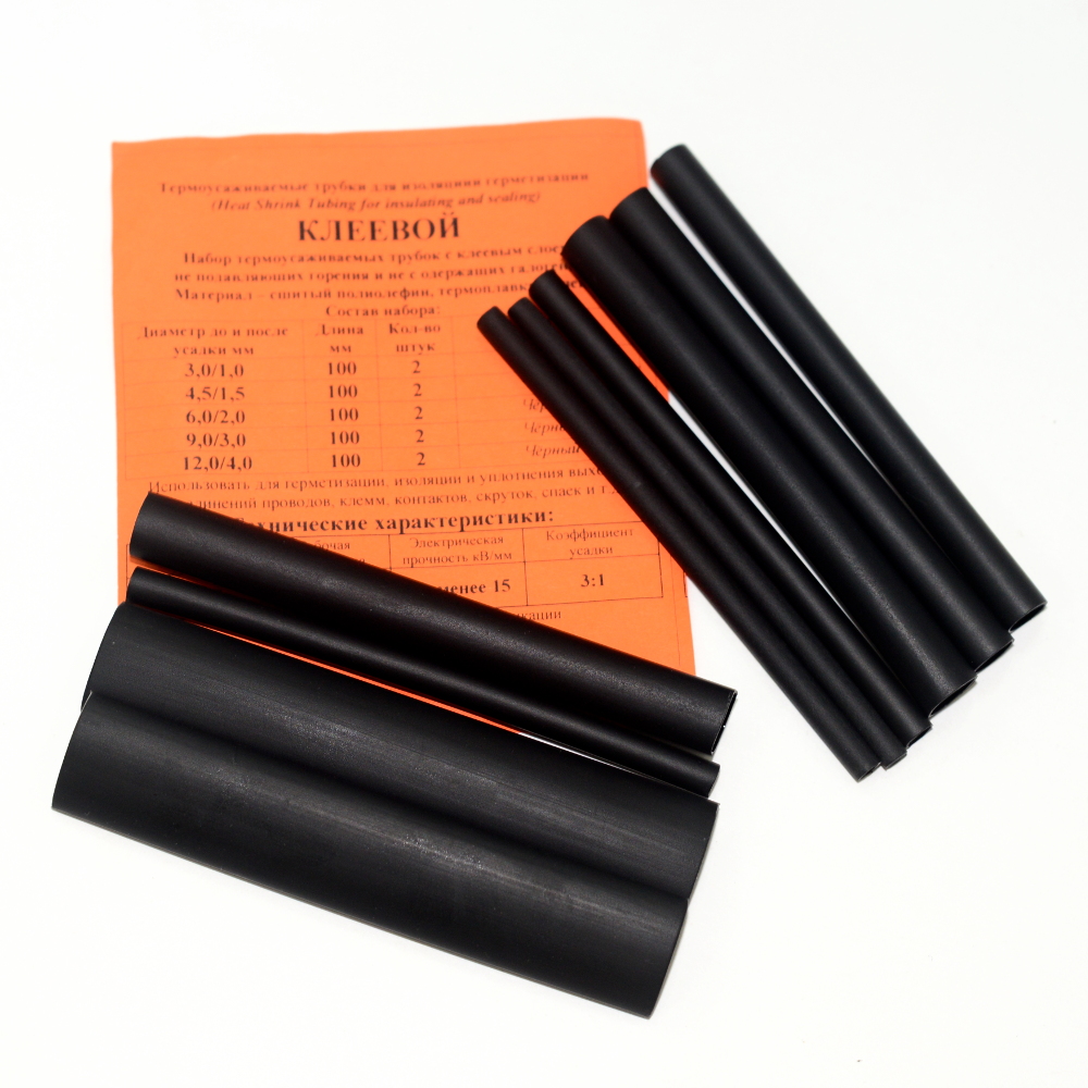 Набор состоит из 10 черных клеевых термоусадочных трубок ТУТ К. Диаметры трубок соответствуют популярным сечениям бытовой и автомобильной электрической проводки. Набор "Клеевой" обойдётся дешевле, чем покупка метровых отрезков трубок каждого диаметра по отдельности.